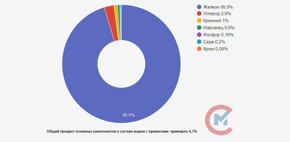 В состав ковкого чугуна входит хлопьевидный графит. Благодаря его содержанию, сплав становится более прочным, пластичным и вязким. Помимо углерода и кремния, в КЧ33-8 также входят добавки марганца, фосфора, серы и хрома, процентное содержание которых, согласно ГОСТ 1215-79, не может быть более 1%.